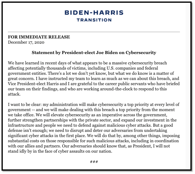 The Next United States president Biden-Harris also shared a press release related to this SunBurst Backdoor. In this statement, the president says that ” We are working with different organizations and we are investigating thoroughly and I have instructed my entire team to learn as much you can from this breach.” The US president also says that they are going to invest more money in upcoming months to make their country’s security effective.