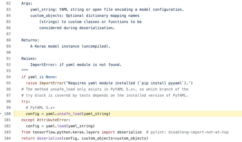 This YAML deserialization vulnerability rated a 9.3 in severity, was responsibly reported to TensorFlow handlers by a security researcher. But what are the sources of the flaw? The well-known “yaml.unsafe_load()” function in TensorFlow code: